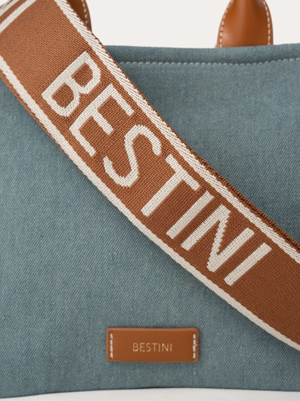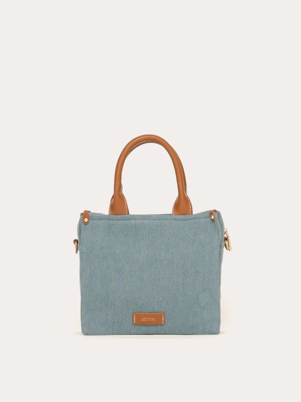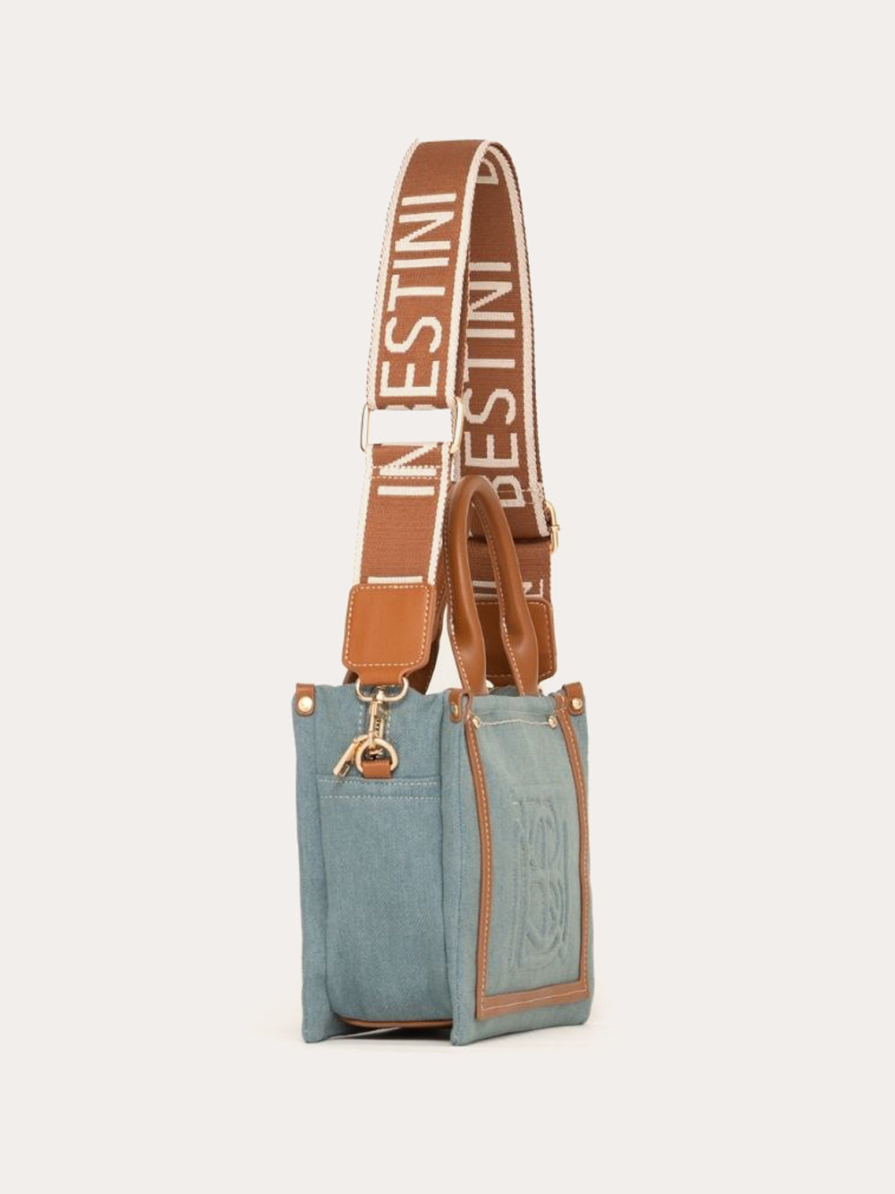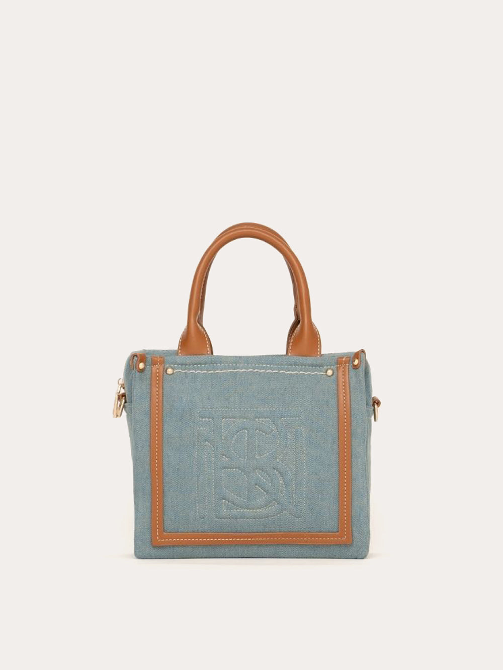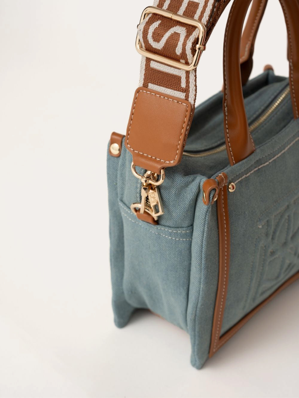Its sleek denim design features a simple, leather-free construction, punctuated by contrasting topstitching and discreet studs.