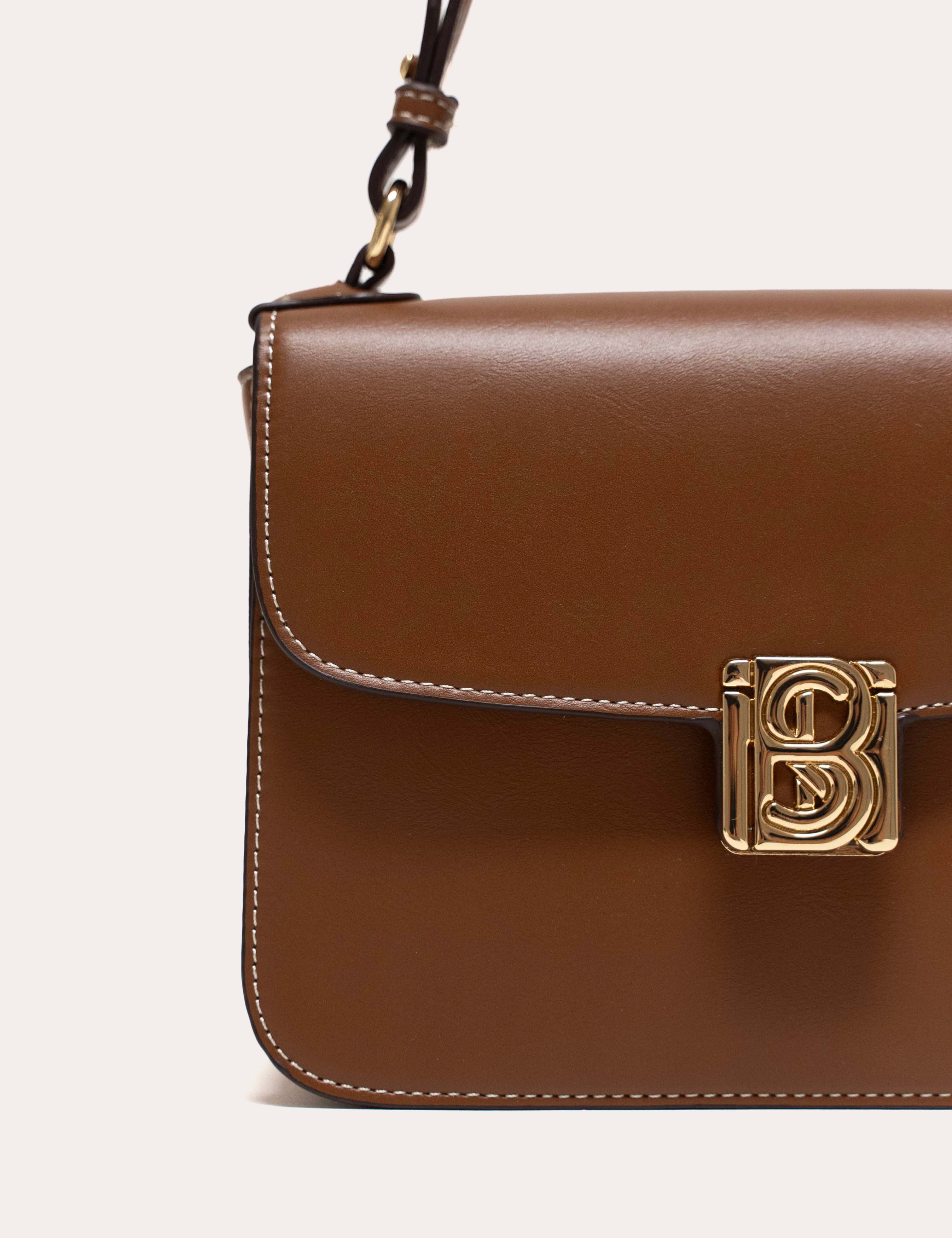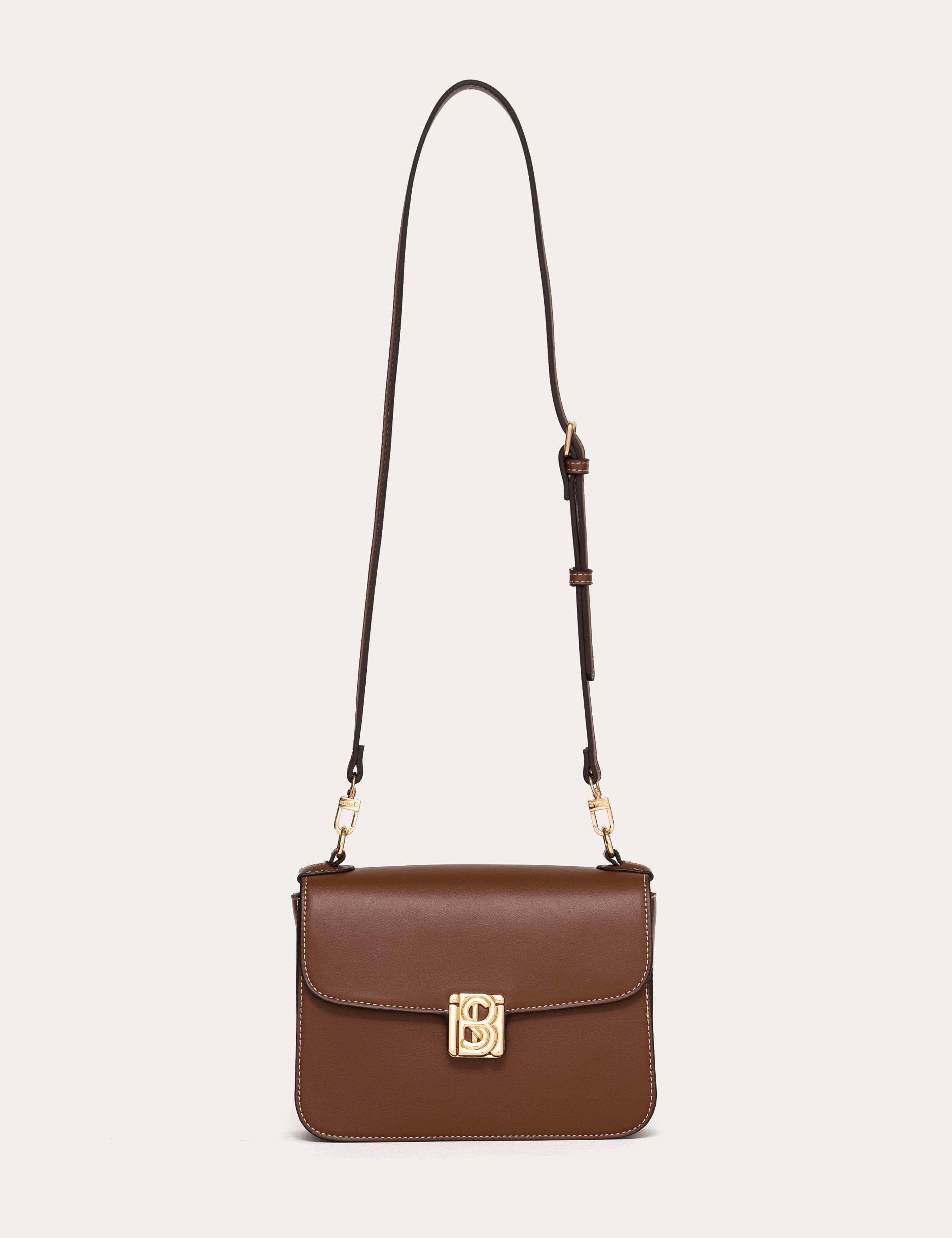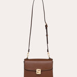 A rectangular format structured by a clean flap and a smooth surface. The signature metal clasp punctuates the center and highlights the bag's graphic line.