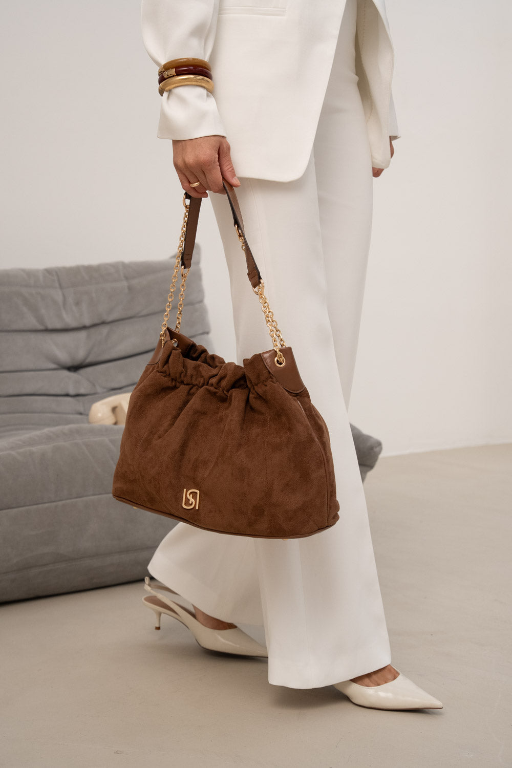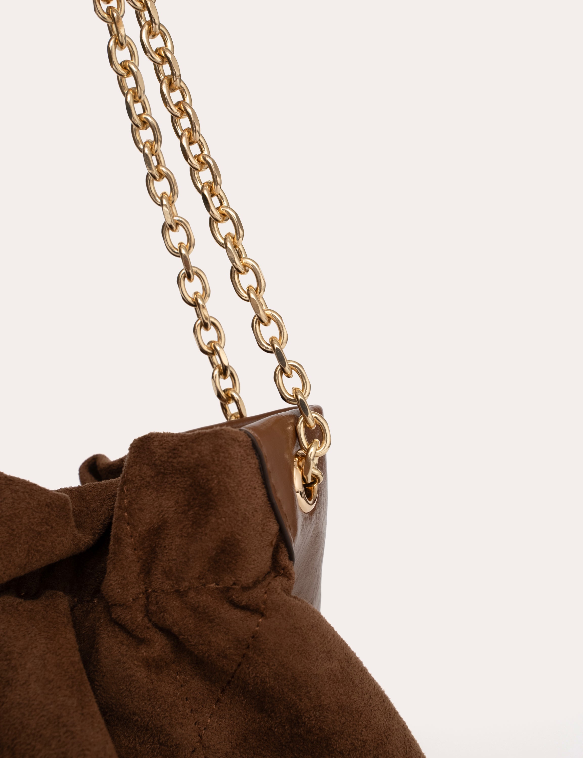 Le toucher velouté nuance la présence du sac et adoucit l’allure.